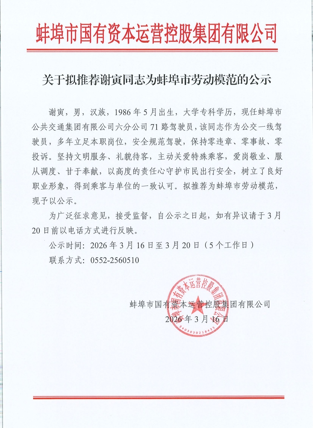 關(guān)于擬推薦謝寅同志為蚌埠市勞動(dòng)模范的公示