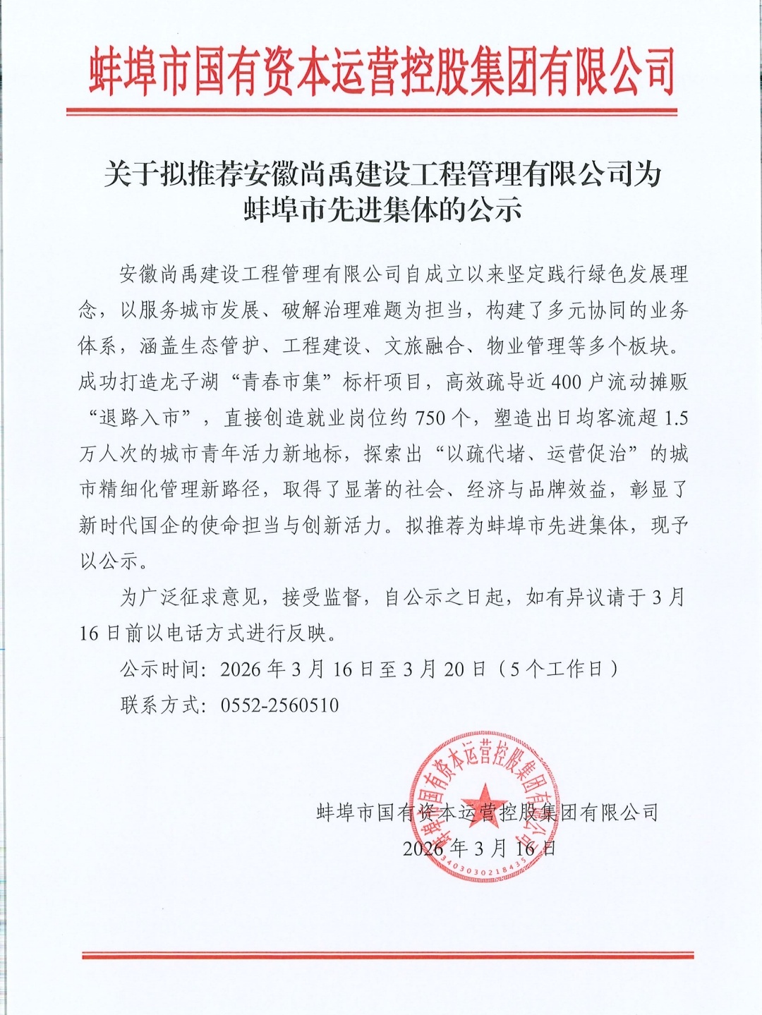 關(guān)于擬推薦安徽尚禹建設(shè)工程管理有限公司為蚌埠市先進(jìn)集體的公示